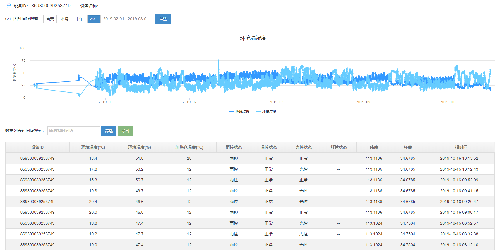 4、設備可以實時顯示空氣溫度、濕度、加熱倉溫度、雨控、溫控、光控的狀態(tài)、經緯度值以及數(shù)據上報的時間。