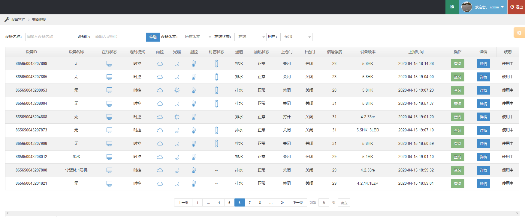 2、可以實時查看設備的定時模式、光控、雨控、溫控、落蟲、加熱、倉門開啟、信號強度、流量使用情況等工作狀態信息,能夠準確的了解設備的實時的工作情況,可對設備出現的故障進行研判、分析、和預警。