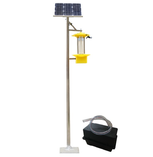 太陽(yáng)能殺蟲(chóng)燈是利用太陽(yáng)能電池板作為用電來(lái)源,其將白天太陽(yáng)能發(fā)的電貯存起來(lái),晚上放電給殺蟲(chóng)燈具,引誘害蟲(chóng)撲向燈的光源,光源外配置高壓擊殺網(wǎng),殺死害蟲(chóng),使害蟲(chóng)落入專(zhuān)用的接蟲(chóng)袋內(nèi),達(dá)到滅殺害蟲(chóng)的目的。